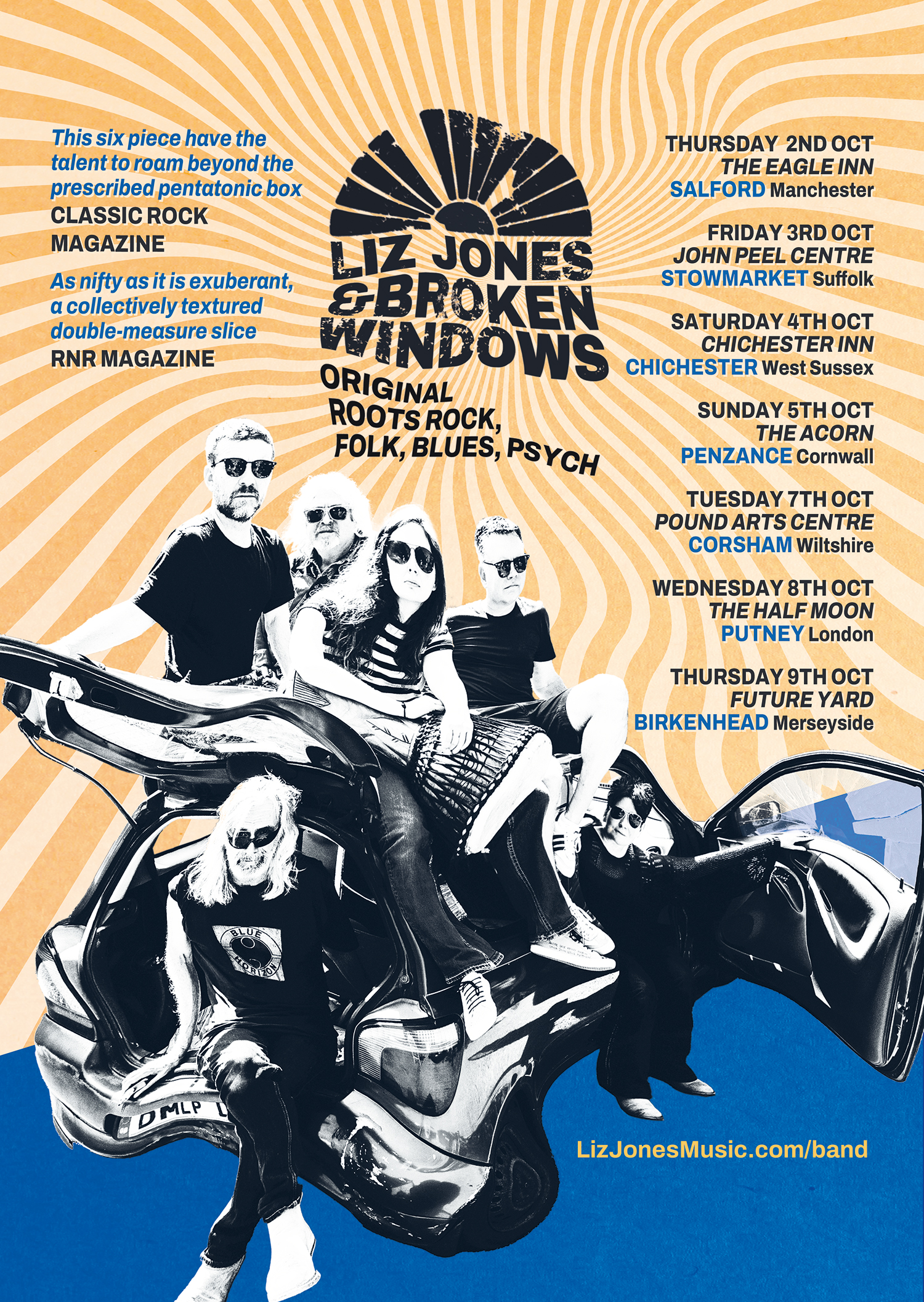 Broken Windows, band of original rootsy and wild creations, take their mood from the genres of blues, folk-rock and psychedelia as a classic stage buzzing “live band”. John Bruce (original guitarist with Blues’N’Trouble) is one of six internationally toured musicians who formed a group the natural way, in jam sessions in the Scottish capitol. Their front woman and songwriter quoted as having “a voice that could wake the dead” leads a band where every player is equal, with shows for lovers of rhythm, solos, musical personality and “not the same old sh*te”!. Recorded work grows new attention with latest album ‘Double Measures’ played on Radio 2, Radio Scotland, Jazz FM and Radio Caroline.